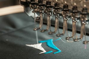 Embroidery menggunakan mesin jahit untuk menjahit desain pada t-shirt, memberikan efek 3D yang profesional.